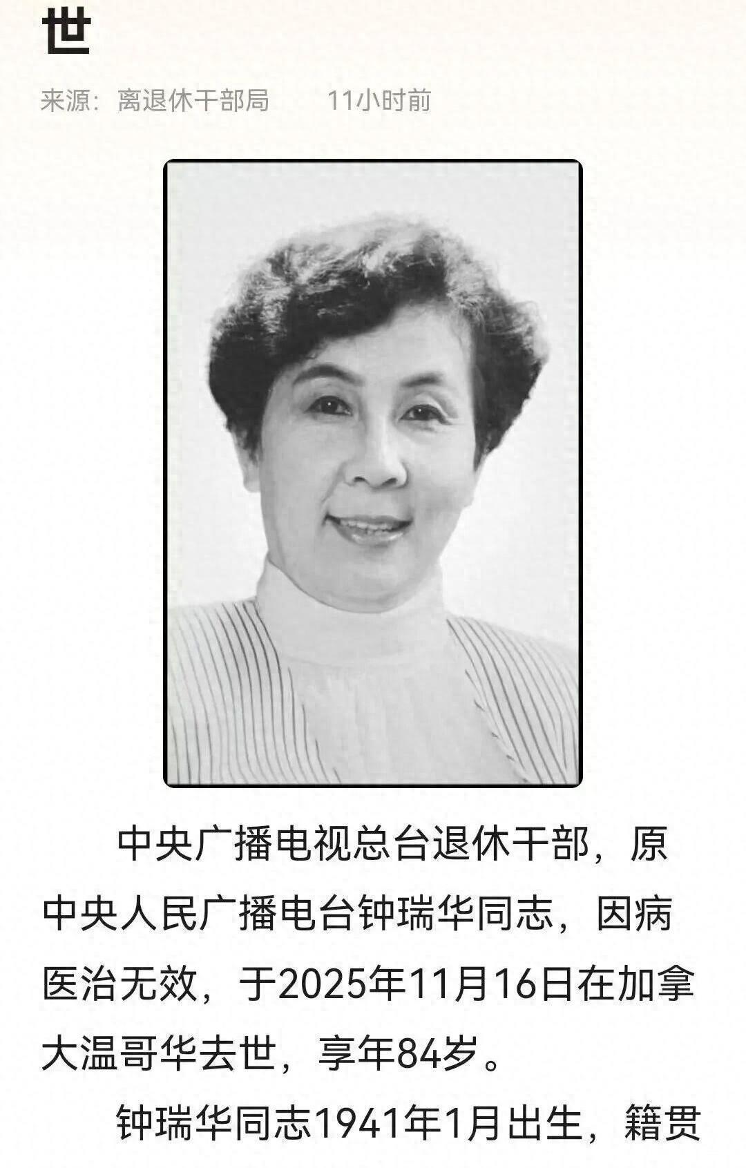 一位时代的老播音员走了。84岁的钟瑞华,原中央人民广播电台的播音艺术家,在2025年11月16日因病医治无效,于温哥华去世,她的一生留下了稳重大气的声音,也未留遗憾。消息来自总台离退休干部局,寥寥几句,却让人打开记忆的门。1941年的北京,一个女婴出生,没人知道她之后会成为中国广播领域的重要人物。1960年,她踏入工作岗位;一年后,她正式加入中央人民广播电台,一干就是几十年,直到2000年,才从岗位上退下来。那些年间,她最让人熟知的,是《新闻和报纸摘要》那份简洁有力、不容置疑的语调,被认为是“时代声音”。